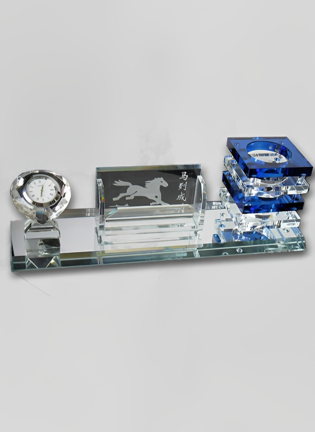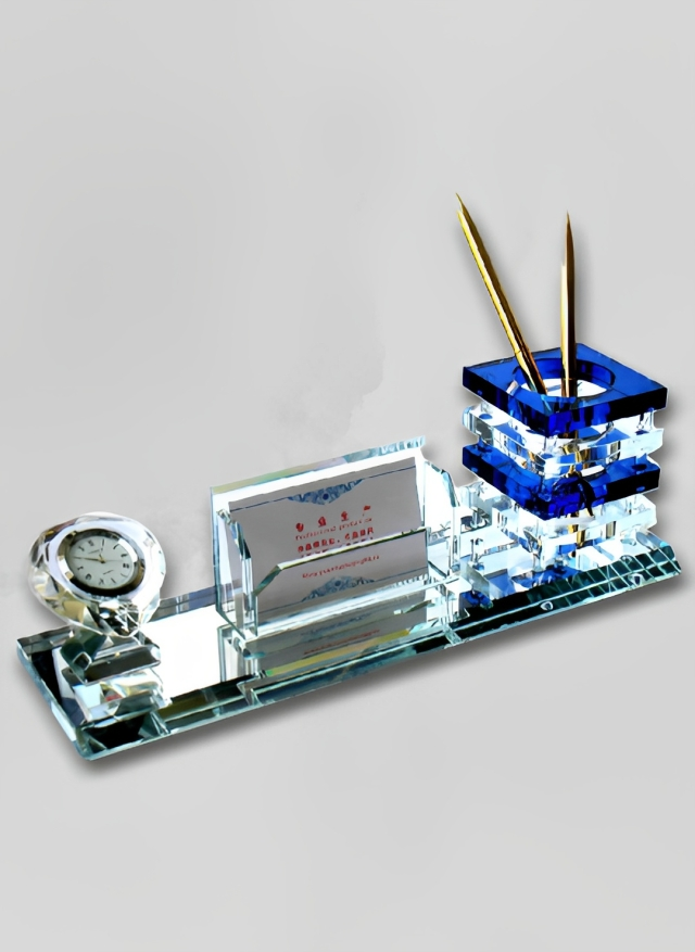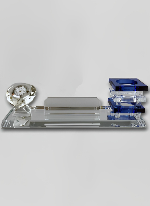 حامل اسم، ساعة، وحامل قلم. تتميز بالأناقة ومصنوعة من أجود أنواع الكريستال لتزيين مكتب شخصية مرموقة.